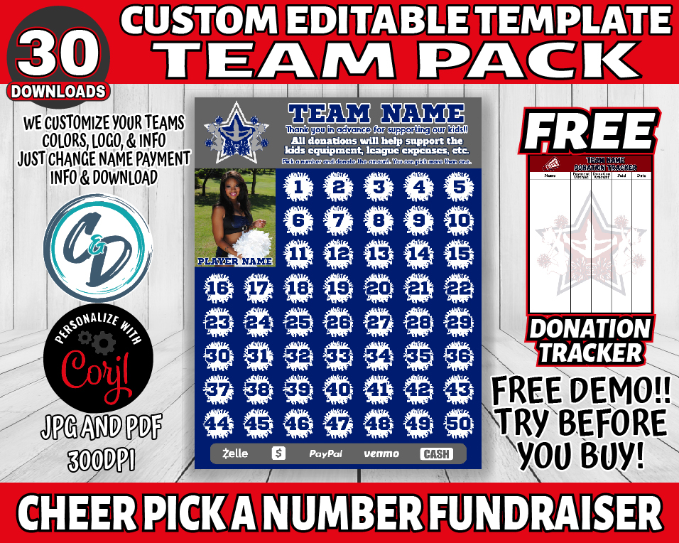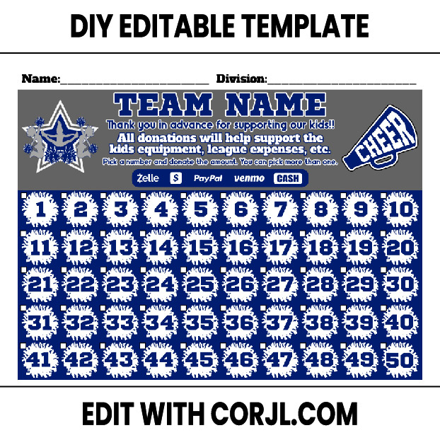 🎉 Corjl-Editable Cheerleading Fundraiser 1 to 50 Template – Your Personalized Fundraising Adventure! 🎉