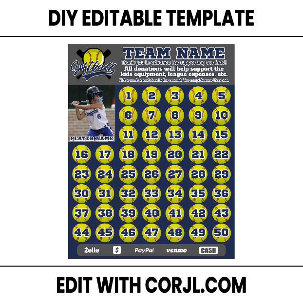 🎉 Corjl-Editable Softball Fundraiser 1 to 50 Template – Your Personalized Fundraising Adventure! 🎉